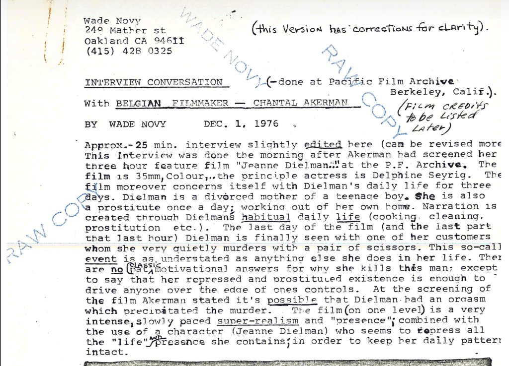 Bu röportaj Akerman’ın üç saatlik uzun metraj filmi “Jeanne Dielman…”ın P.F. Archive’daki gösteriminden sonraki günün sabahı gerçekleştirilmiştir. Film 35mm, renkli. Başrol oyuncusu ise Delphine Seyrig. Film, Dielman’ın günlük hayatından üç günü konu alır. Dielman ergen bir oğlu olan boşanmış bir annedir. Aynı zamanda gün aşırı bir seks işçisidir; kendi evinden çalışır. Olay örgüsü Dielman’ın alışkanlıklarla örülmüş günlük hayatından oluşmaktadır (yemek, temizlik, seks işçiliği vs.). Çekimin son gününde (ayrıca filmin son bir saatinin son kısmı) Dielman, sonunda bir makas yardımıyla usulca katlettiği müşterilerinden biriyle görülmektedir. Bu adına “olay” dediğimiz de hayatında yaptığı her şey gibi şaşaasızdır. Bu adamı öldürme nedenine verecek klasik bir cevabı yoktur, baskılanmış ve “fahişeleşmiş” benliğinin insanı kontrol altındaki sınırlarının ötesine itmeye yetecek olması dışında. Filmin gösteriminde Akerman, Dielman’ın cinayeti hızlandıran bir orgazm yaşamış olmasının mümkün olduğunu belirtti. Film (bir kademede) oldukça yoğun, yavaş tempolu süper-gerçekçi ve “varolan”; günlük örüntüsünü stabil tutmak için içinde barındırdığı tüm yaşamı ve varlığı bastırıyor gibi görünen bir karakterin (Jeanne Dielman) kullanımıyla birleştirilmiştir.